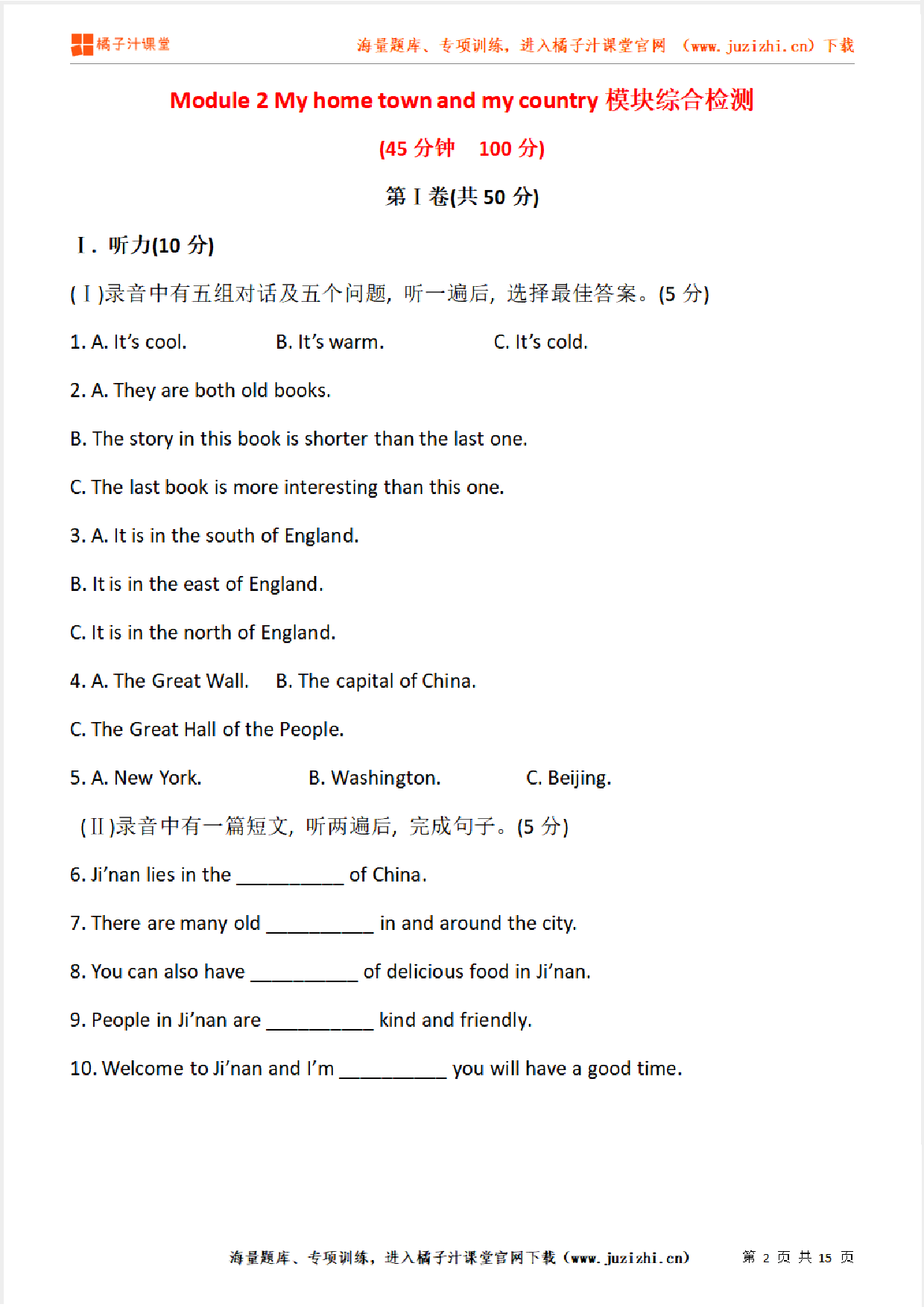 这份资料:【外研版初中英语】八年级上册Module 2 单元综合检测卷(含听力)由【橘子汁课堂】整理提供,各位家长老师可直接在线下载,下载后使用打印机打印使用。也可以保存下方练习题图片打印,提供给学生可直接练习。 同时,我们也提供了手机端练习工具,可以使用手机扫描右侧卡片二维码,进入我们的题库小程序练习。