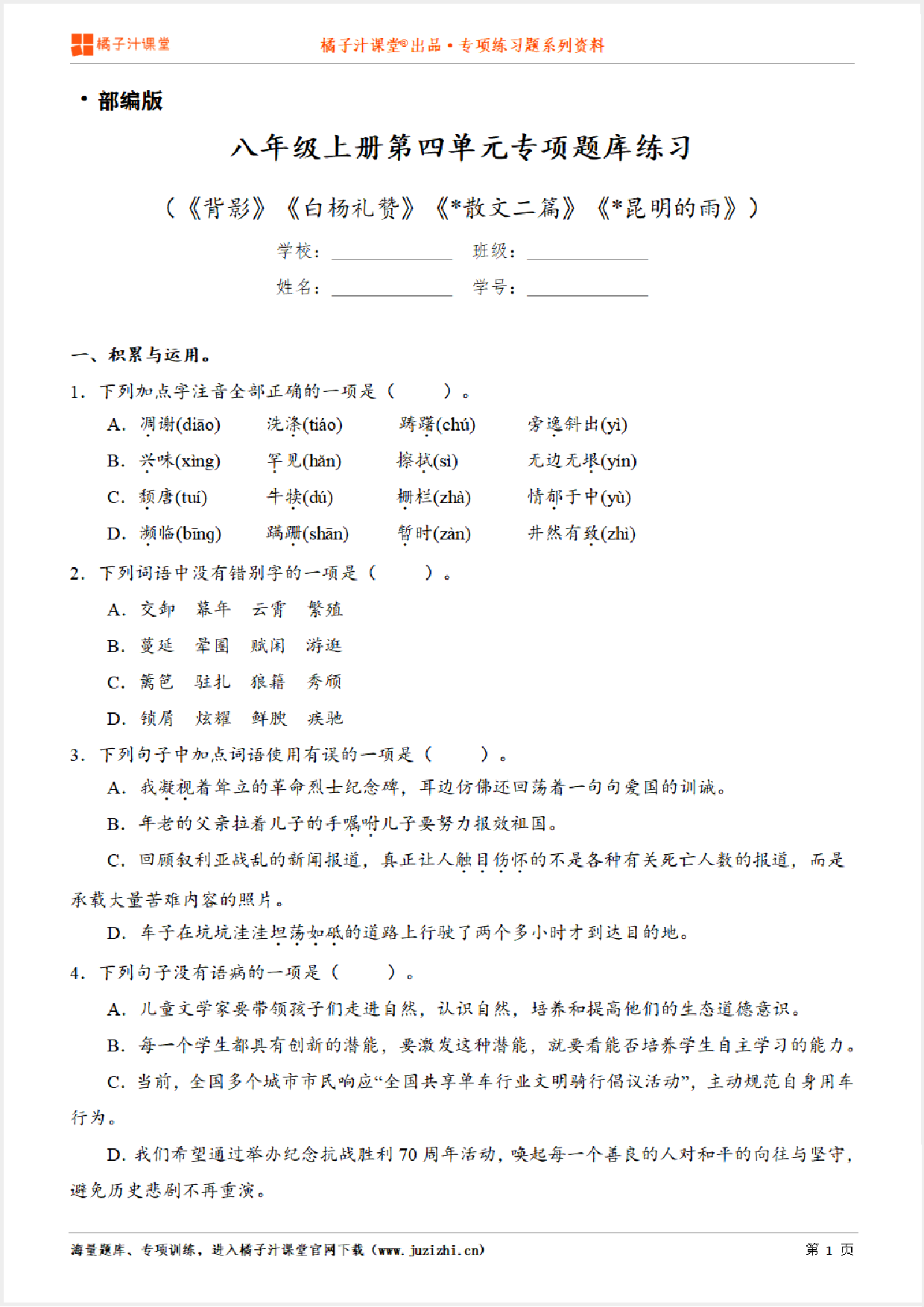 这份资料:【部编版语文】八年级上册第四单元专项练习题由【橘子汁课堂】整理提供,各位家长老师可直接在线下载,下载后使用打印机打印使用。也可以保存下方练习题图片打印,提供给学生可直接练习。 同时,我们也提供了手机端练习工具,可以使用手机扫描右侧卡片二维码,进入我们的题库小程序练习。