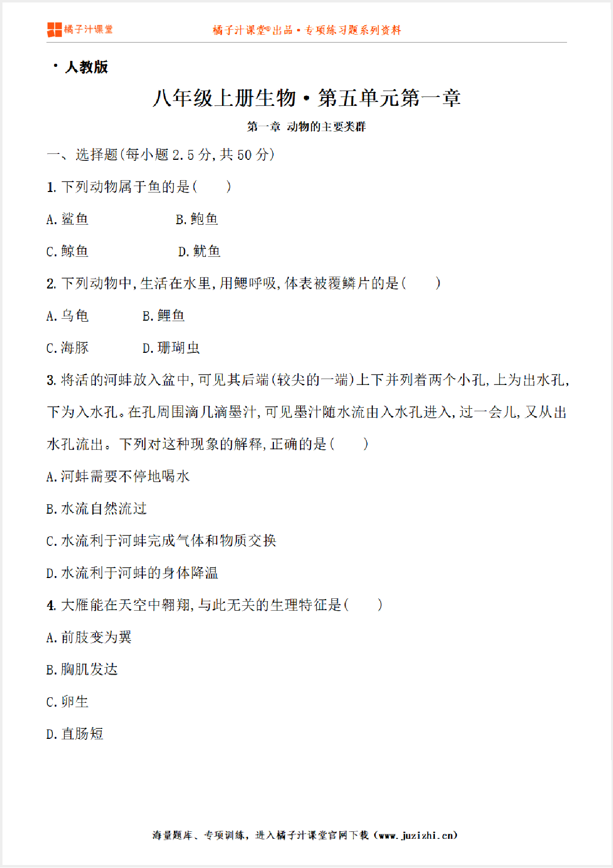 这份资料:【人教版生物】八年级上册第五单元第一章测试卷由【橘子汁课堂】整理提供,各位家长老师可直接在线下载,下载后使用打印机打印使用。也可以保存下方练习题图片打印,提供给学生可直接练习。 同时,我们也提供了手机端练习工具,可以使用手机扫描右侧卡片二维码,进入我们的题库小程序练习。