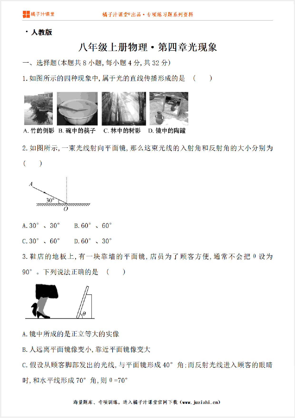 这份资料:【人教版物理】八年级上册第四章《光现象》测试卷由【橘子汁课堂】整理提供,各位家长老师可直接在线下载,下载后使用打印机打印使用。也可以保存下方练习题图片打印,提供给学生可直接练习。 同时,我们也提供了手机端练习工具,可以使用手机扫描右侧卡片二维码,进入我们的题库小程序练习。