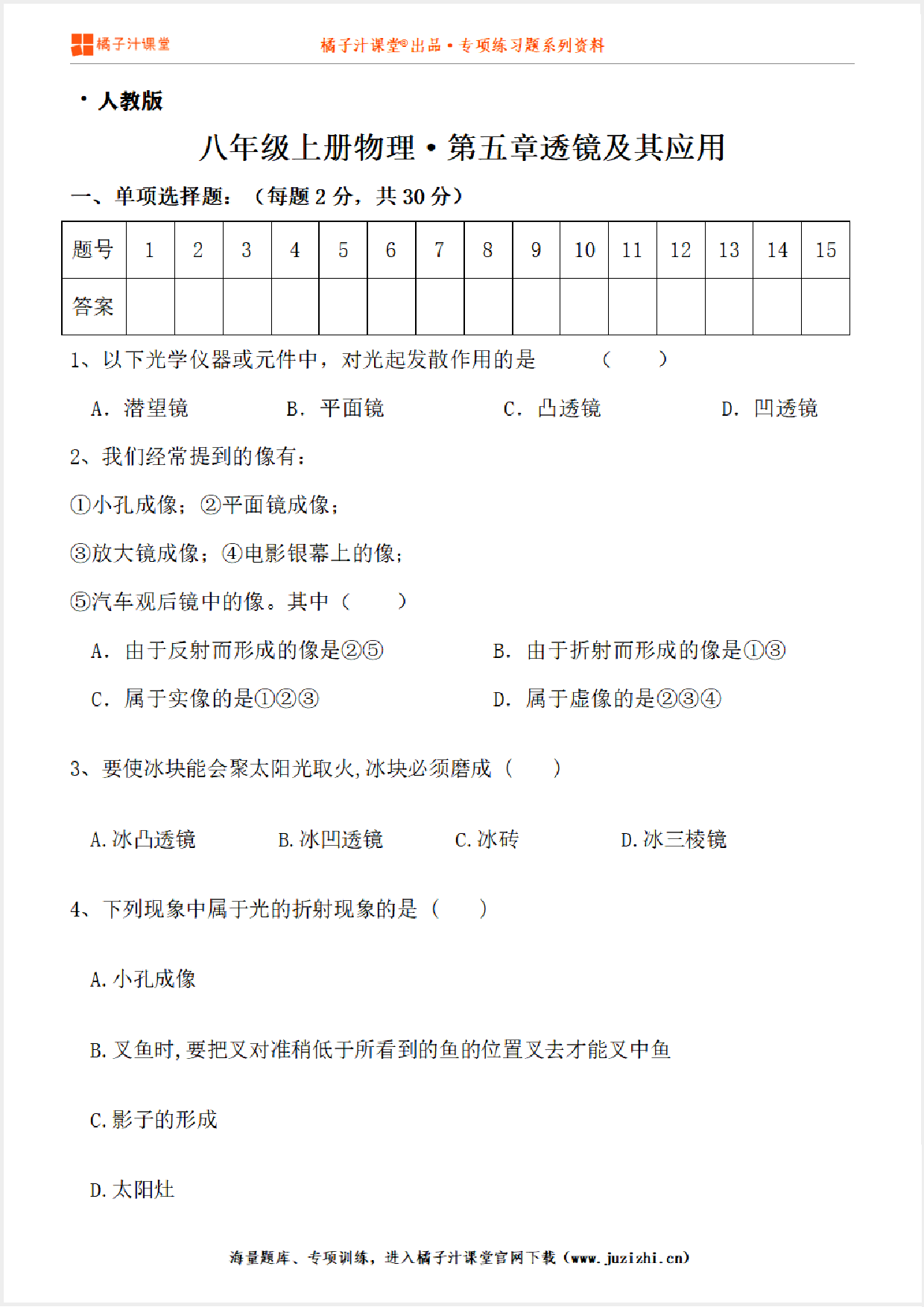 这份资料:【人教版物理】八年级上册第五章《透镜及其应用》测试卷由【橘子汁课堂】整理提供,各位家长老师可直接在线下载,下载后使用打印机打印使用。也可以保存下方练习题图片打印,提供给学生可直接练习。 同时,我们也提供了手机端练习工具,可以使用手机扫描右侧卡片二维码,进入我们的题库小程序练习。