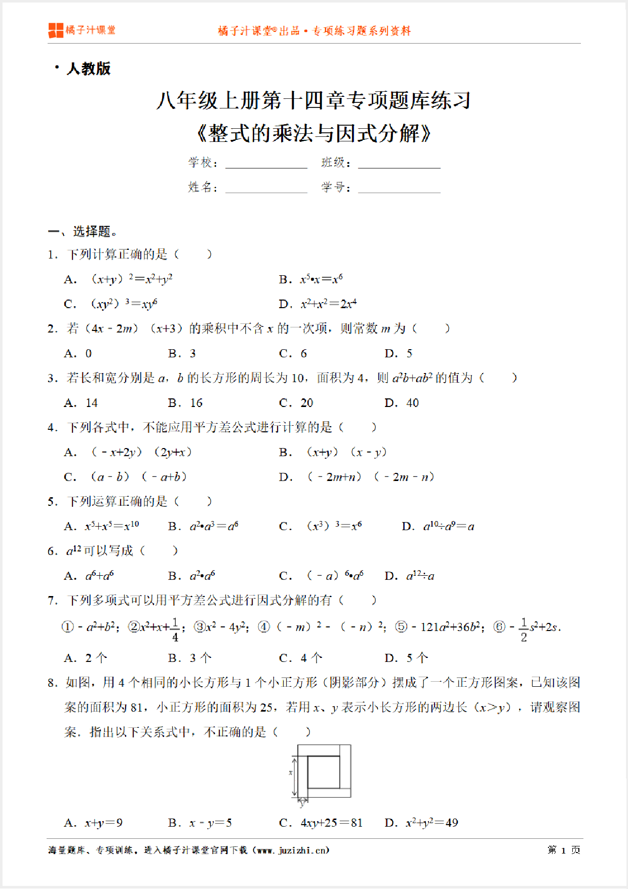 这份资料:【人教版数学】八年级上册第十四章《整式的乘法与因式分解》专项练习题由【橘子汁课堂】整理提供,各位家长老师可直接在线下载,下载后使用打印机打印使用。也可以保存下方练习题图片打印,提供给学生可直接练习。 同时,我们也提供了手机端练习工具,可以使用手机扫描右侧卡片二维码,进入我们的题库小程序练习。