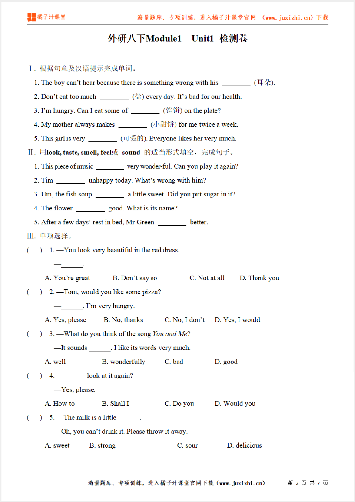 这份资料:【外研版初中英语】八年级下册Module 1 单元综合检测卷由【橘子汁课堂】整理提供,各位家长老师可直接在线下载,下载后使用打印机打印使用。也可以保存下方练习题图片打印,提供给学生可直接练习。 同时,我们也提供了手机端练习工具,可以使用手机扫描右侧卡片二维码,进入我们的题库小程序练习。