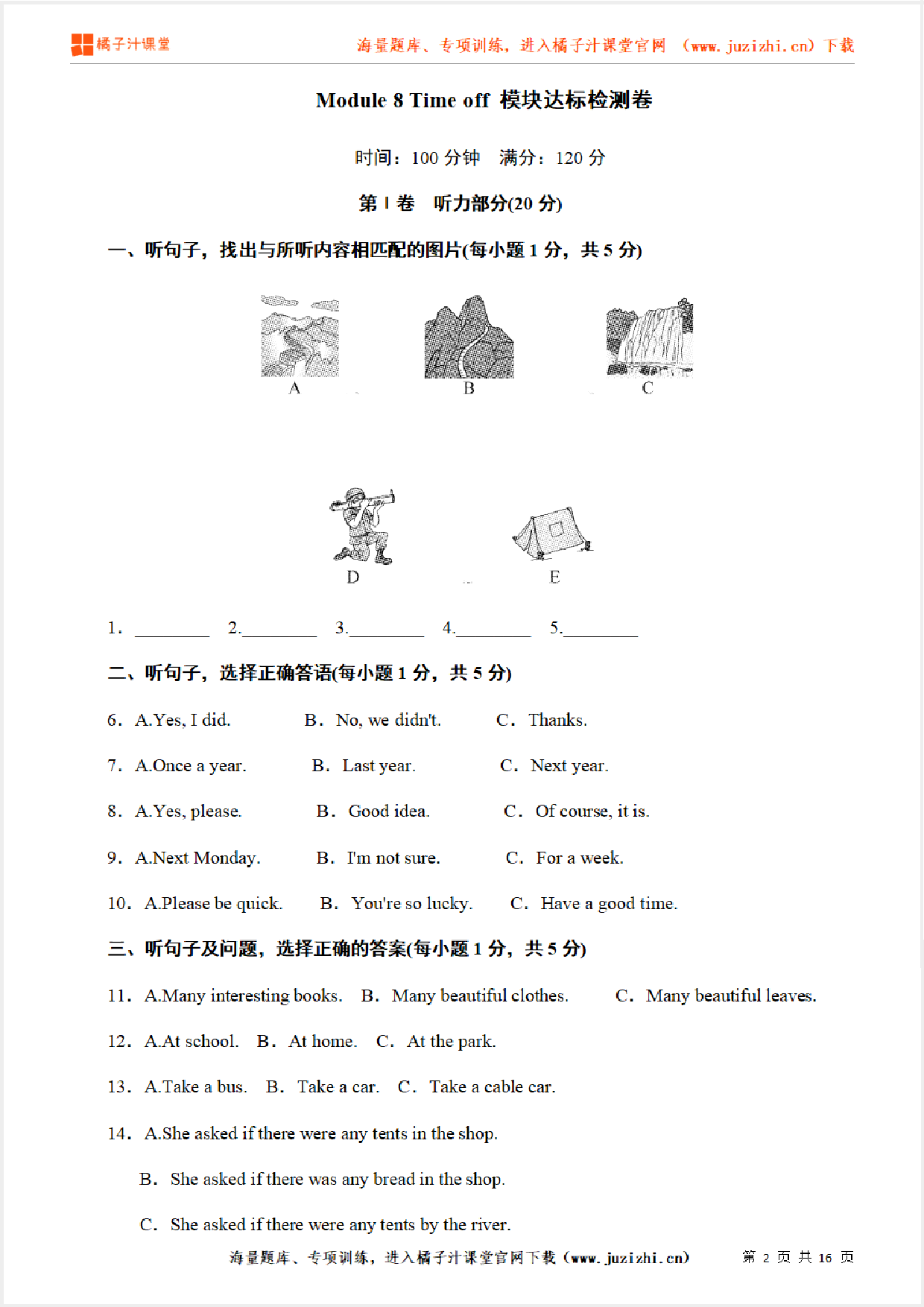 这份资料:【外研版初中英语】八年级下册Module 8 单元综合检测卷(含听力)由【橘子汁课堂】整理提供,各位家长老师可直接在线下载,下载后使用打印机打印使用。也可以保存下方练习题图片打印,提供给学生可直接练习。 同时,我们也提供了手机端练习工具,可以使用手机扫描右侧卡片二维码,进入我们的题库小程序练习。