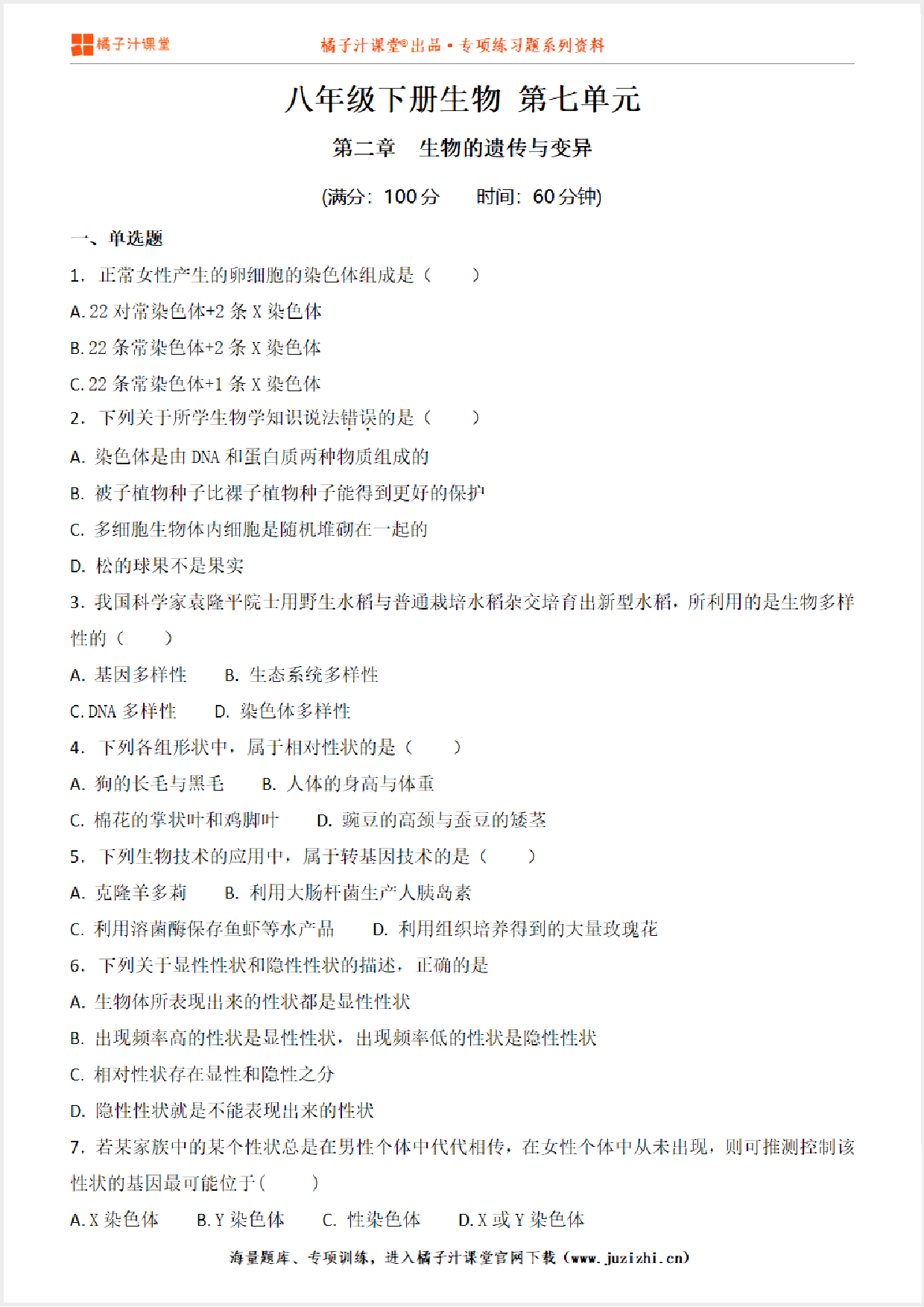 这份资料:【八年级生物】下册第七单元第2章《生物的遗传与变异》单元测试卷由【橘子汁课堂】整理提供,各位家长老师可直接在线下载,下载后使用打印机打印使用。也可以保存下方练习题图片打印,提供给学生可直接练习。 同时,我们也提供了手机端练习工具,可以使用手机扫描右侧卡片二维码,进入我们的题库小程序练习。