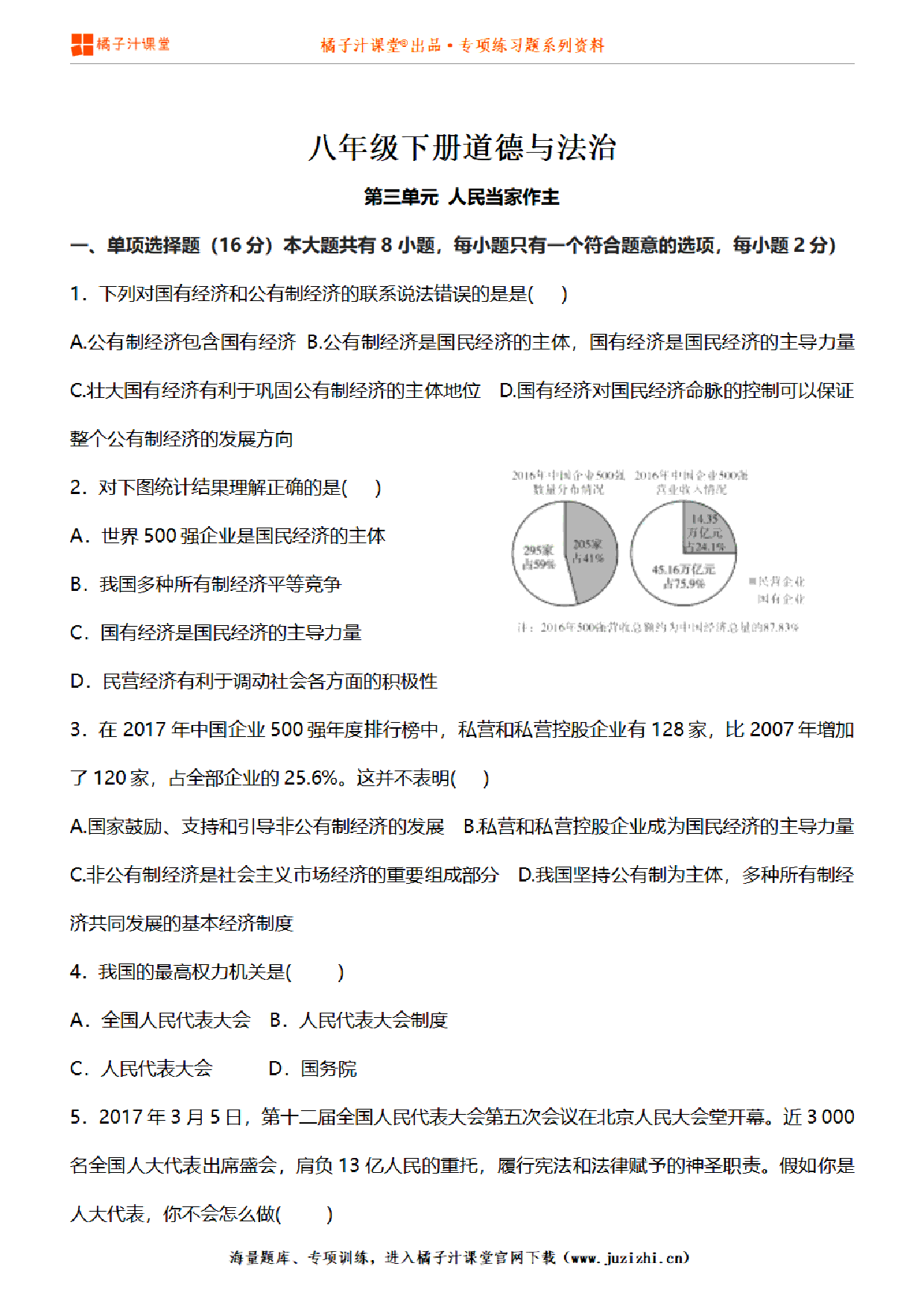 这份资料:【道德与法治人教版】八年级下册第3单元测试卷由【橘子汁课堂】整理提供,各位家长老师可直接在线下载,下载后使用打印机打印使用。也可以保存下方练习题图片打印,提供给学生可直接练习。 同时,我们也提供了手机端练习工具,可以使用手机扫描右侧卡片二维码,进入我们的题库小程序练习。