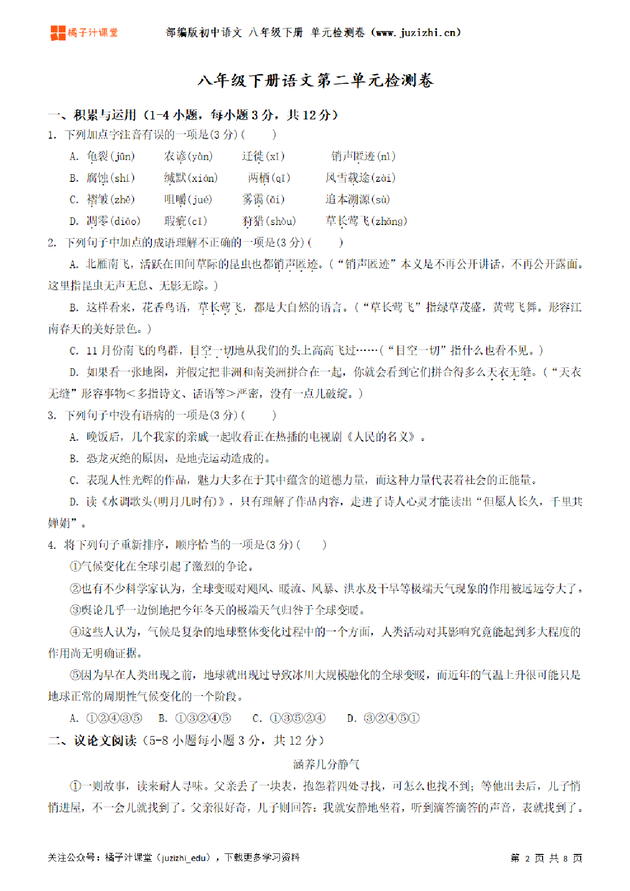 这份资料:【部编版语文】八年级下册第2单元练习题由【橘子汁课堂】整理提供,各位家长老师可直接在线下载,下载后使用打印机打印使用。也可以保存下方练习题图片打印,提供给学生可直接练习。 同时,我们也提供了手机端练习工具,可以使用手机扫描右侧卡片二维码,进入我们的题库小程序练习。