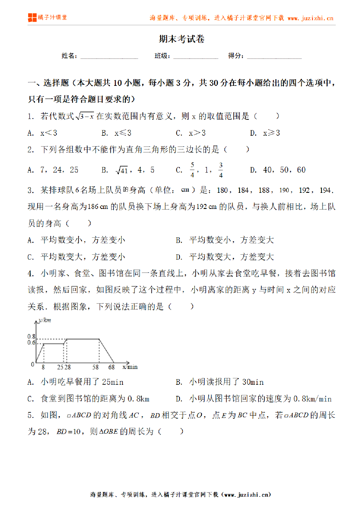 这份资料:【人教版数学】八年级下册期末测试卷(1)由【橘子汁课堂】整理提供,各位家长老师可直接在线下载,下载后使用打印机打印使用。也可以保存下方练习题图片打印,提供给学生可直接练习。 同时,我们也提供了手机端练习工具,可以使用手机扫描右侧卡片二维码,进入我们的题库小程序练习。