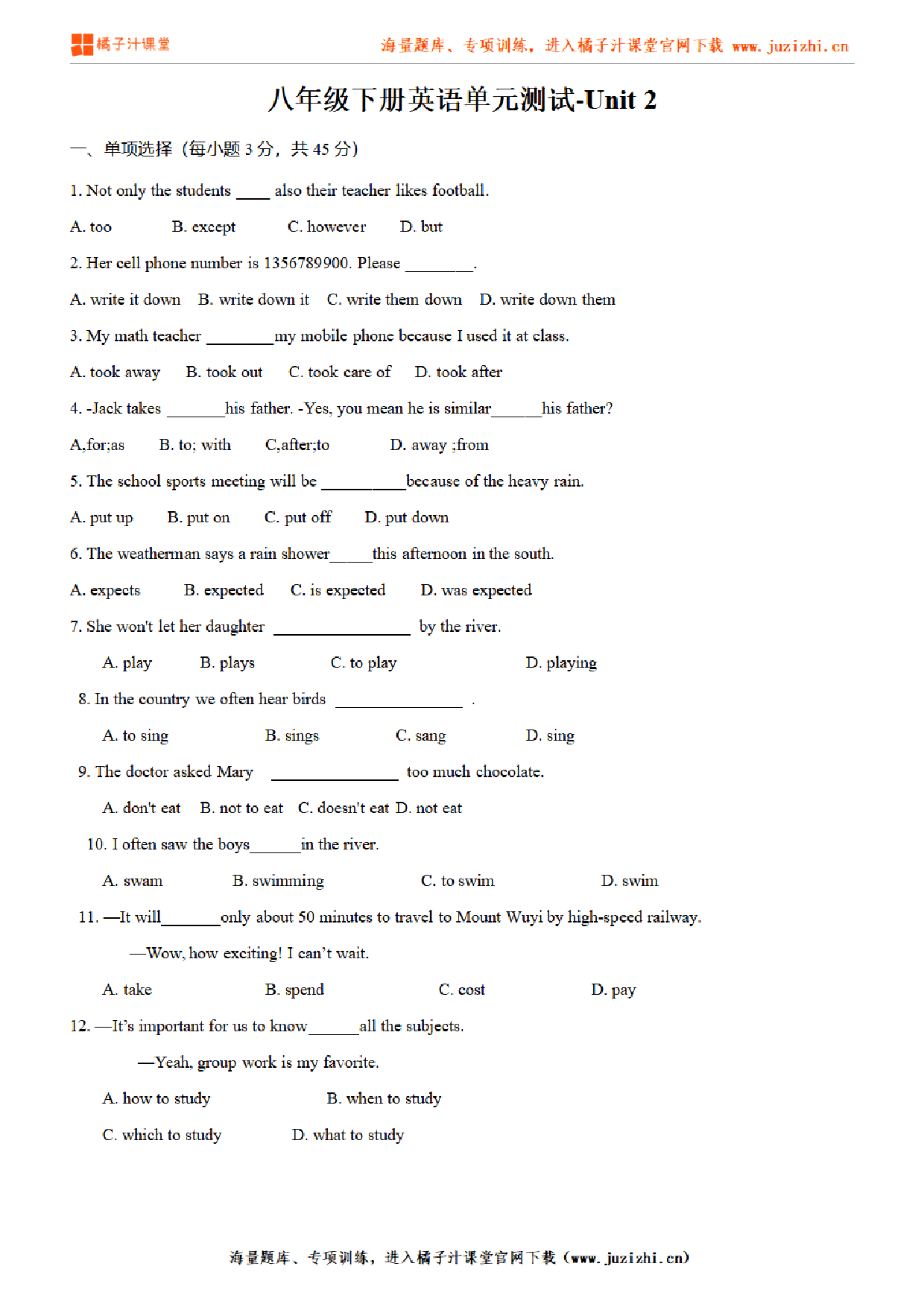 这份资料:【人教新目标英语】八年级下册Unit2检测卷由【橘子汁课堂】整理提供,各位家长老师可直接在线下载,下载后使用打印机打印使用。也可以保存下方练习题图片打印,提供给学生可直接练习。 同时,我们也提供了手机端练习工具,可以使用手机扫描右侧卡片二维码,进入我们的题库小程序练习。
