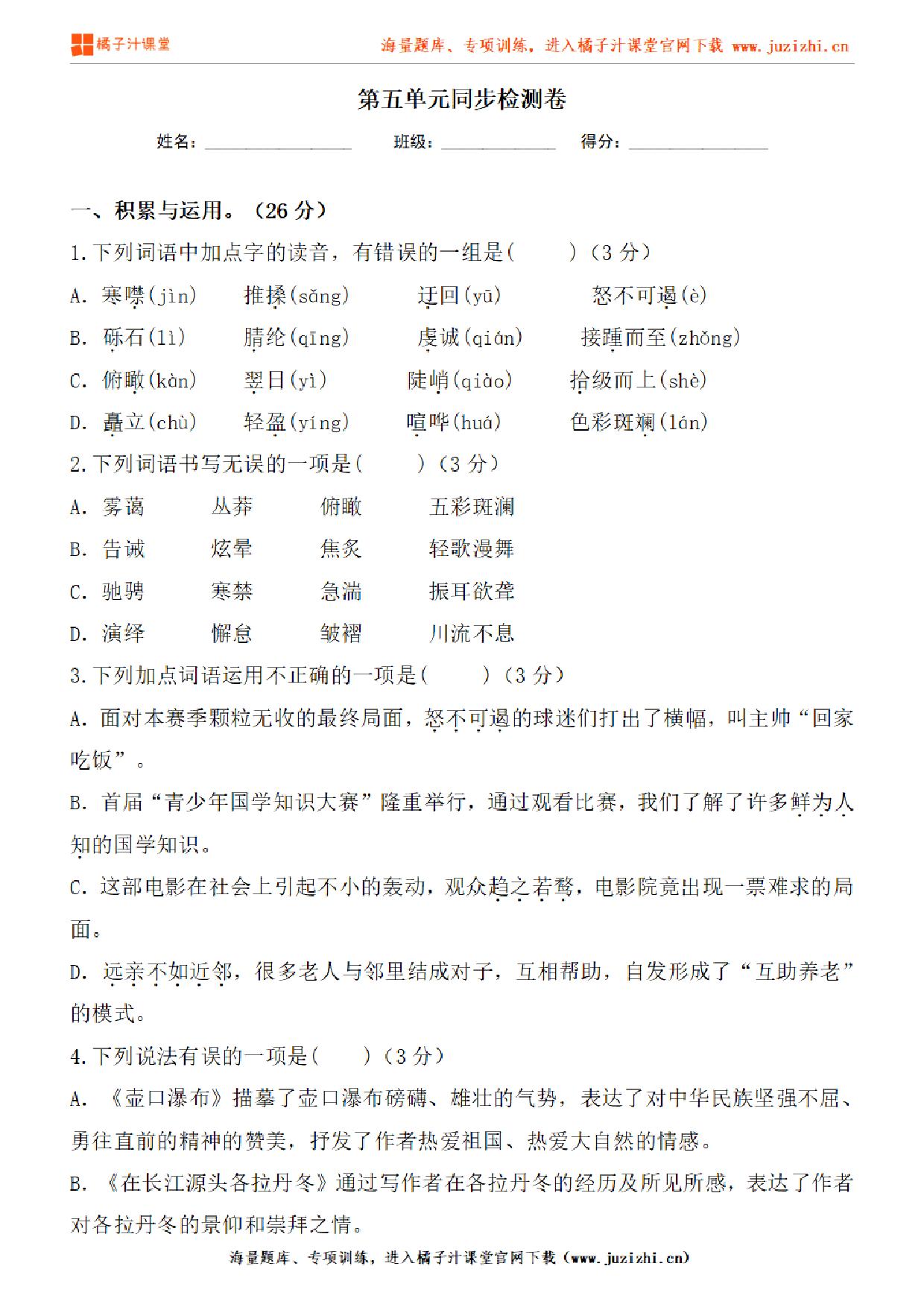 这份资料:【部编版语文】八年级下册第五单元提升练习由【橘子汁课堂】整理提供,各位家长老师可直接在线下载,下载后使用打印机打印使用。也可以保存下方练习题图片打印,提供给学生可直接练习。 同时,我们也提供了手机端练习工具,可以使用手机扫描右侧卡片二维码,进入我们的题库小程序练习。