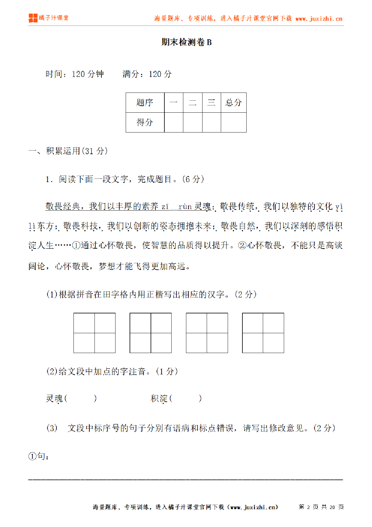 这份资料:【部编版语文】九年级上册期末测试卷(二)由【橘子汁课堂】整理提供,各位家长老师可直接在线下载,下载后使用打印机打印使用。也可以保存下方练习题图片打印,提供给学生可直接练习。 同时,我们也提供了手机端练习工具,可以使用手机扫描右侧卡片二维码,进入我们的题库小程序练习。