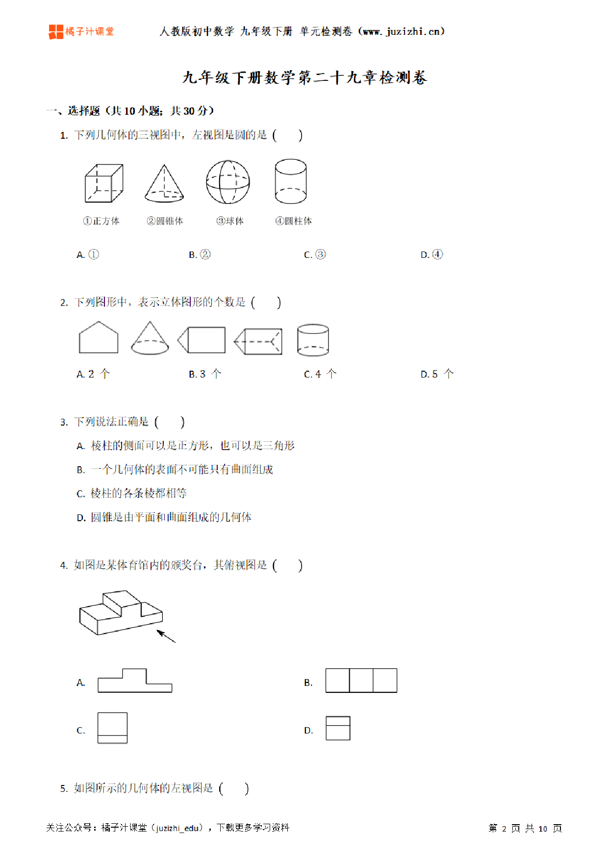 这份资料:【人教版数学】九年级下册第29章单元练习题由【橘子汁课堂】整理提供,各位家长老师可直接在线下载,下载后使用打印机打印使用。也可以保存下方练习题图片打印,提供给学生可直接练习。 同时,我们也提供了手机端练习工具,可以使用手机扫描右侧卡片二维码,进入我们的题库小程序练习。