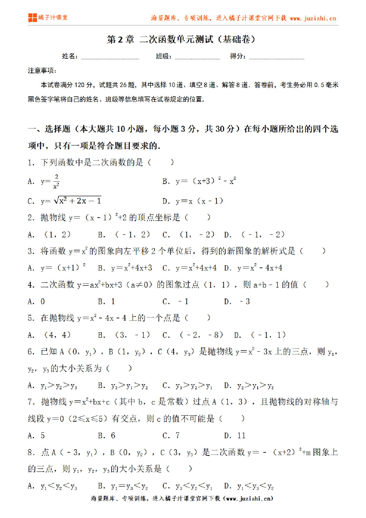 这份资料:【北师大版数学】九年级下册第二单元基础检测卷由【橘子汁课堂】整理提供,各位家长老师可直接在线下载,下载后使用打印机打印使用。也可以保存下方练习题图片打印,提供给学生可直接练习。 同时,我们也提供了手机端练习工具,可以使用手机扫描右侧卡片二维码,进入我们的题库小程序练习。