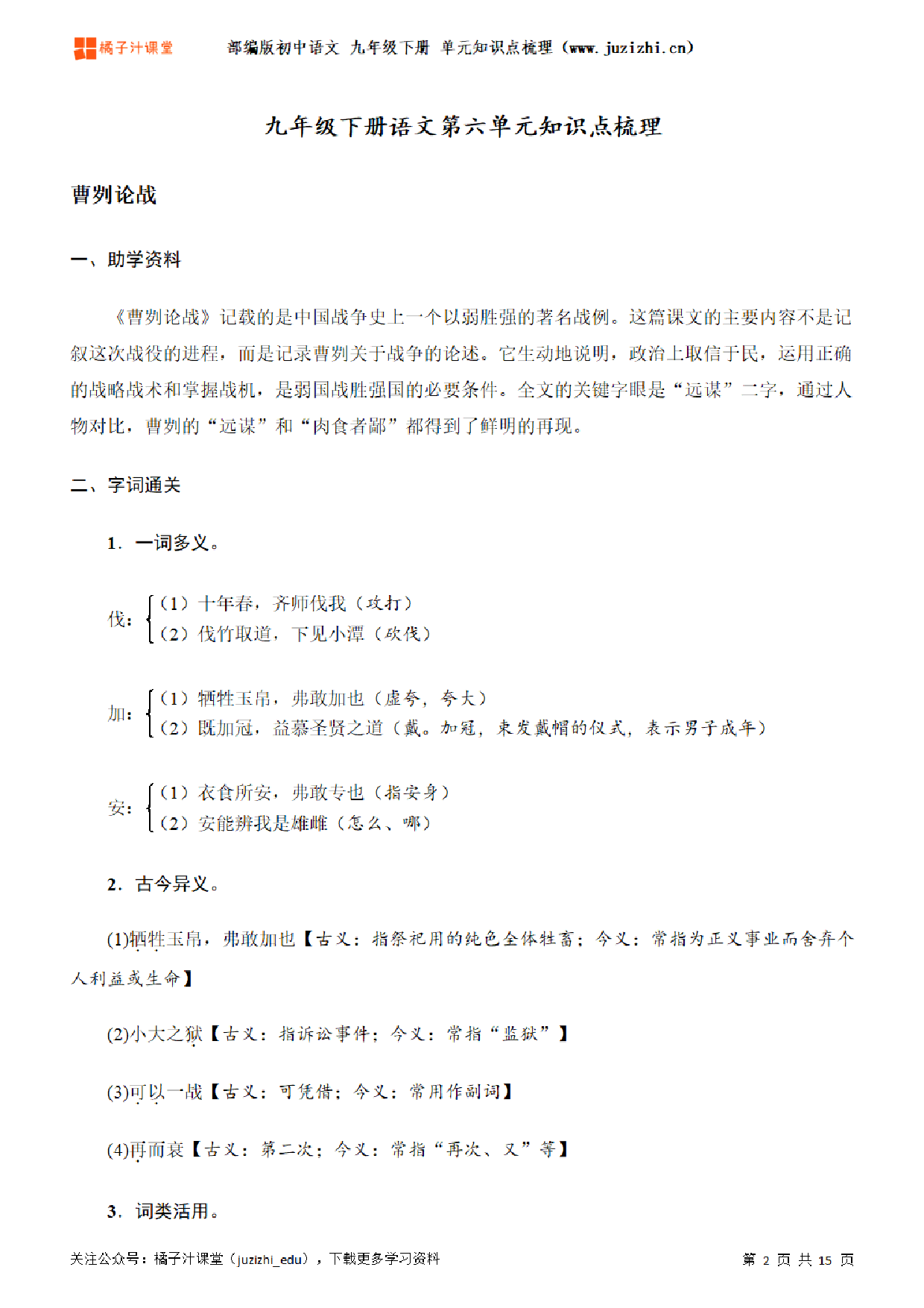 这份资料:部编版初中语文九年级下册第六单元知识点梳理由【橘子汁课堂】整理提供,各位家长老师可直接在线下载,下载后使用打印机打印使用。也可以保存下方练习题图片打印,提供给学生可直接练习。 同时,我们也提供了手机端练习工具,可以使用手机扫描右侧卡片二维码,进入我们的题库小程序练习。