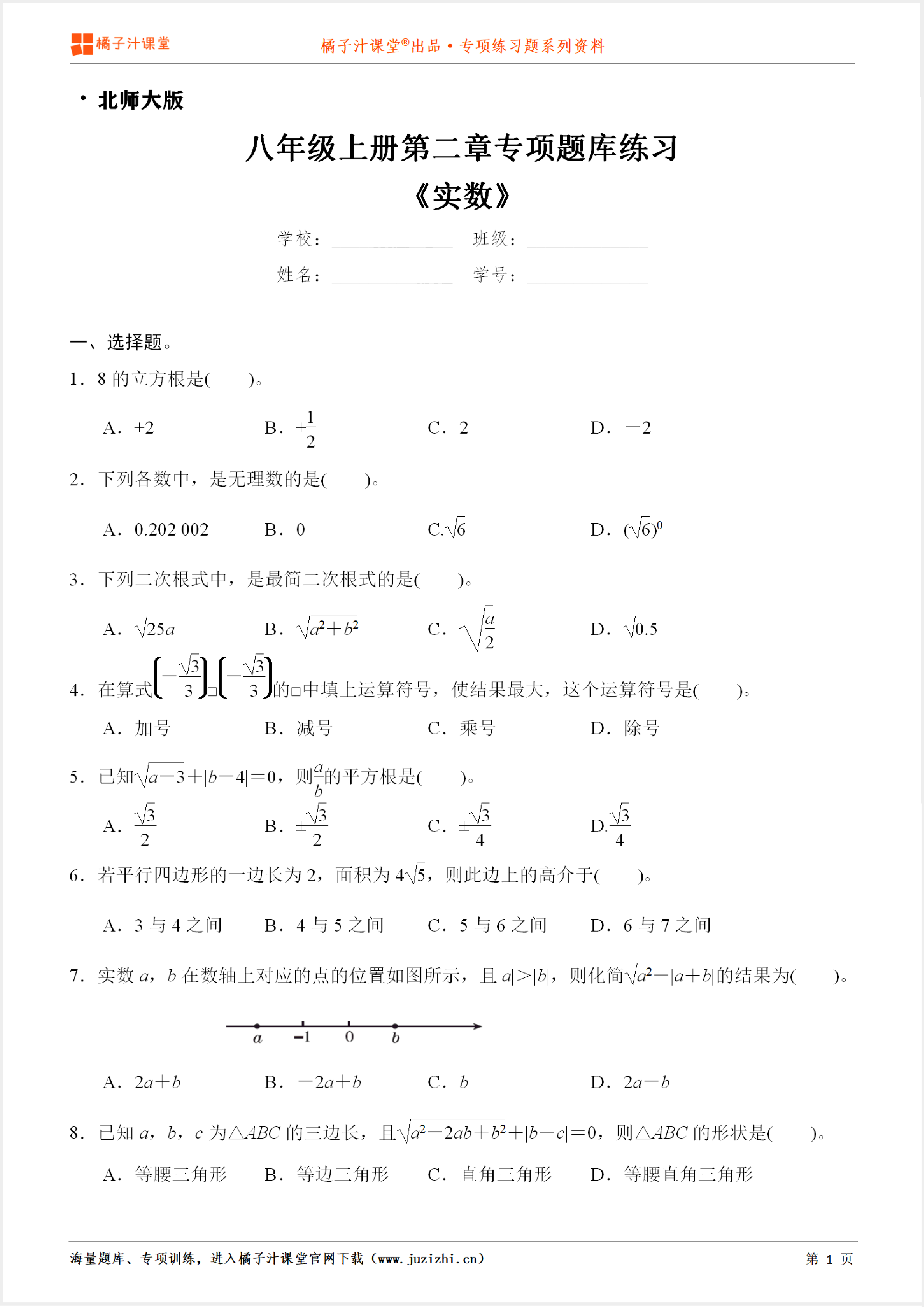 这份资料:《【北师大版数学】八年级上册第二章《实数》专项练习题》由【橘子汁课堂】整理提供,各位家长老师可直接在线下载,下载后使用打印机打印使用。也可以保存下方练习题图片打印,提供给学生可直接练习。 同时,我们也提供了手机端练习工具,可以使用手机扫描右侧卡片二维码,进入我们的题库小程序练习。