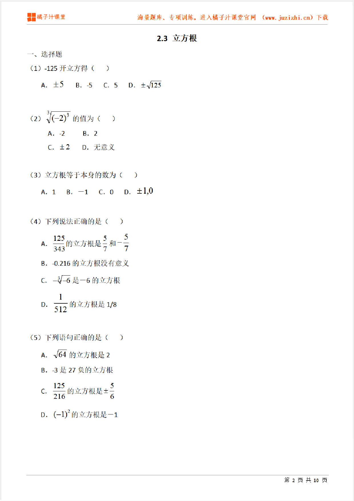这份资料:《【北师大版数学】八年级上册第二章《立方根》专项练习题》由【橘子汁课堂】整理提供,各位家长老师可直接在线下载,下载后使用打印机打印使用。也可以保存下方练习题图片打印,提供给学生可直接练习。 同时,我们也提供了手机端练习工具,可以使用手机扫描右侧卡片二维码,进入我们的题库小程序练习。