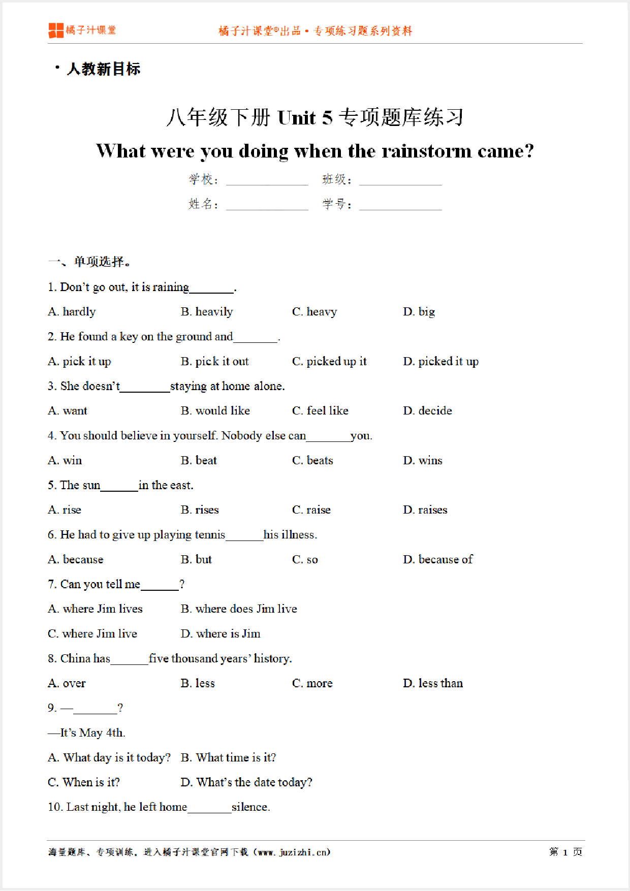 这份资料:《【人教新目标英语】八年级下册Unit5 What were you doing when the rainstorm came练习题》由【橘子汁课堂】整理提供,各位家长老师可直接在线下载,下载后使用打印机打印使用。也可以保存下方练习题图片打印,提供给学生可直接练习。 同时,我们也提供了手机端练习工具,可以使用手机扫描右侧卡片二维码,进入我们的题库小程序练习。