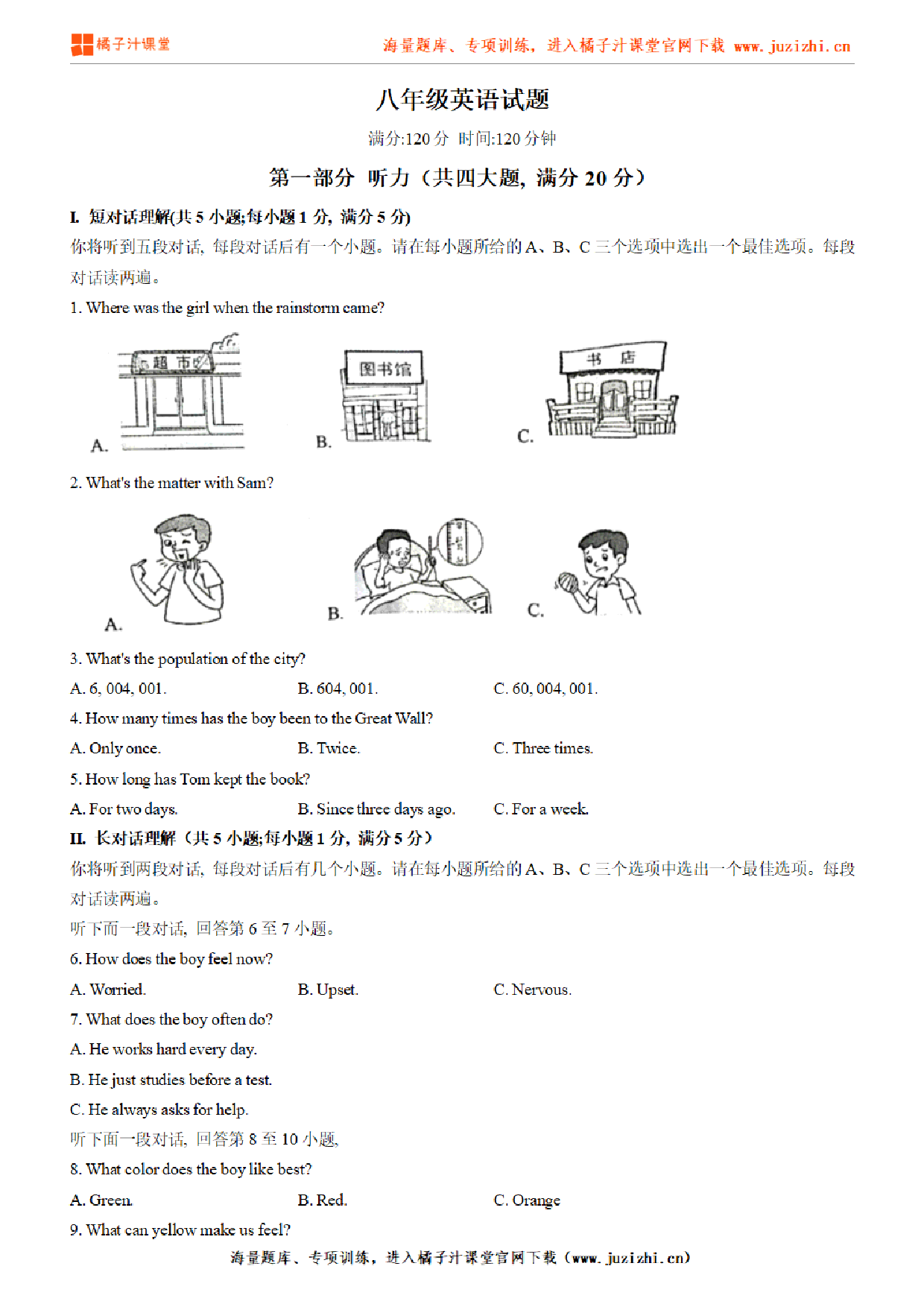 这份资料:《【人教新目标英语】八年级下册期末测试卷2(含听力)》由【橘子汁课堂】整理提供,各位家长老师可直接在线下载,下载后使用打印机打印使用。也可以保存下方练习题图片打印,提供给学生可直接练习。 同时,我们也提供了手机端练习工具,可以使用手机扫描右侧卡片二维码,进入我们的题库小程序练习。