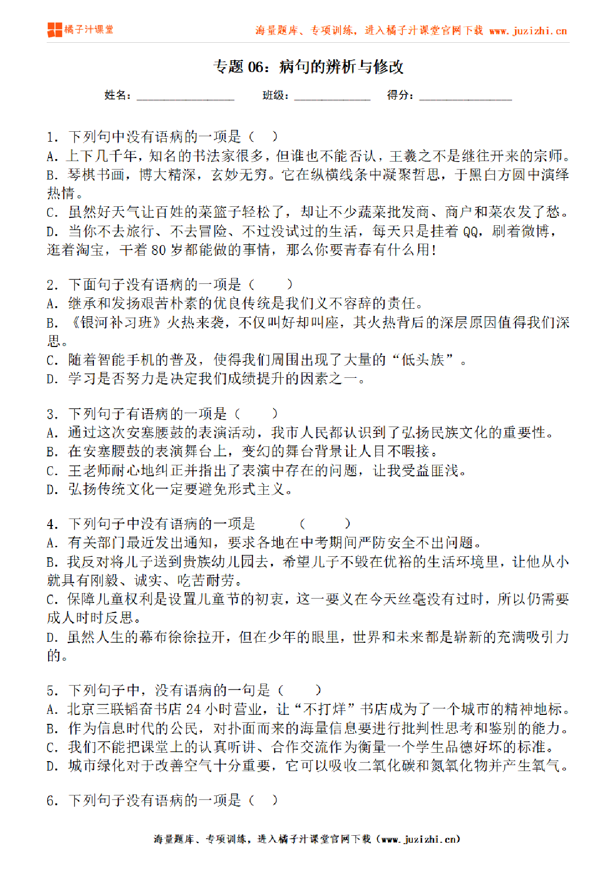 这份资料:《【部编版语文】八年级下册专项练习题《病句的辨析与修改》测试卷》由【橘子汁课堂】整理提供,各位家长老师可直接在线下载,下载后使用打印机打印使用。也可以保存下方练习题图片打印,提供给学生可直接练习。 同时,我们也提供了手机端练习工具,可以使用手机扫描右侧卡片二维码,进入我们的题库小程序练习。