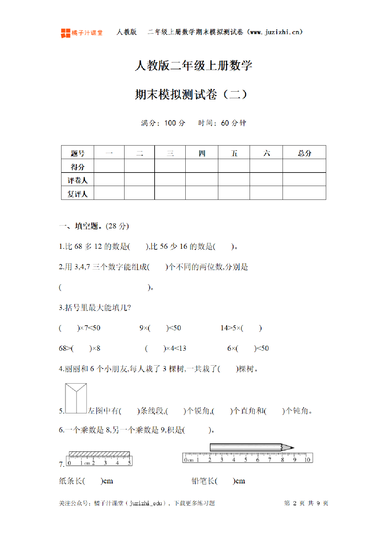 这份资料:《【人教版数学】二年级上册《期末模拟测试卷二》》由【橘子汁课堂】整理提供,各位家长老师可直接在线下载,下载后使用打印机打印使用。也可以保存下方练习题图片打印,提供给学生可直接练习。 同时,我们也提供了手机端练习工具,可以使用手机扫描右侧卡片二维码,进入我们的题库小程序练习。