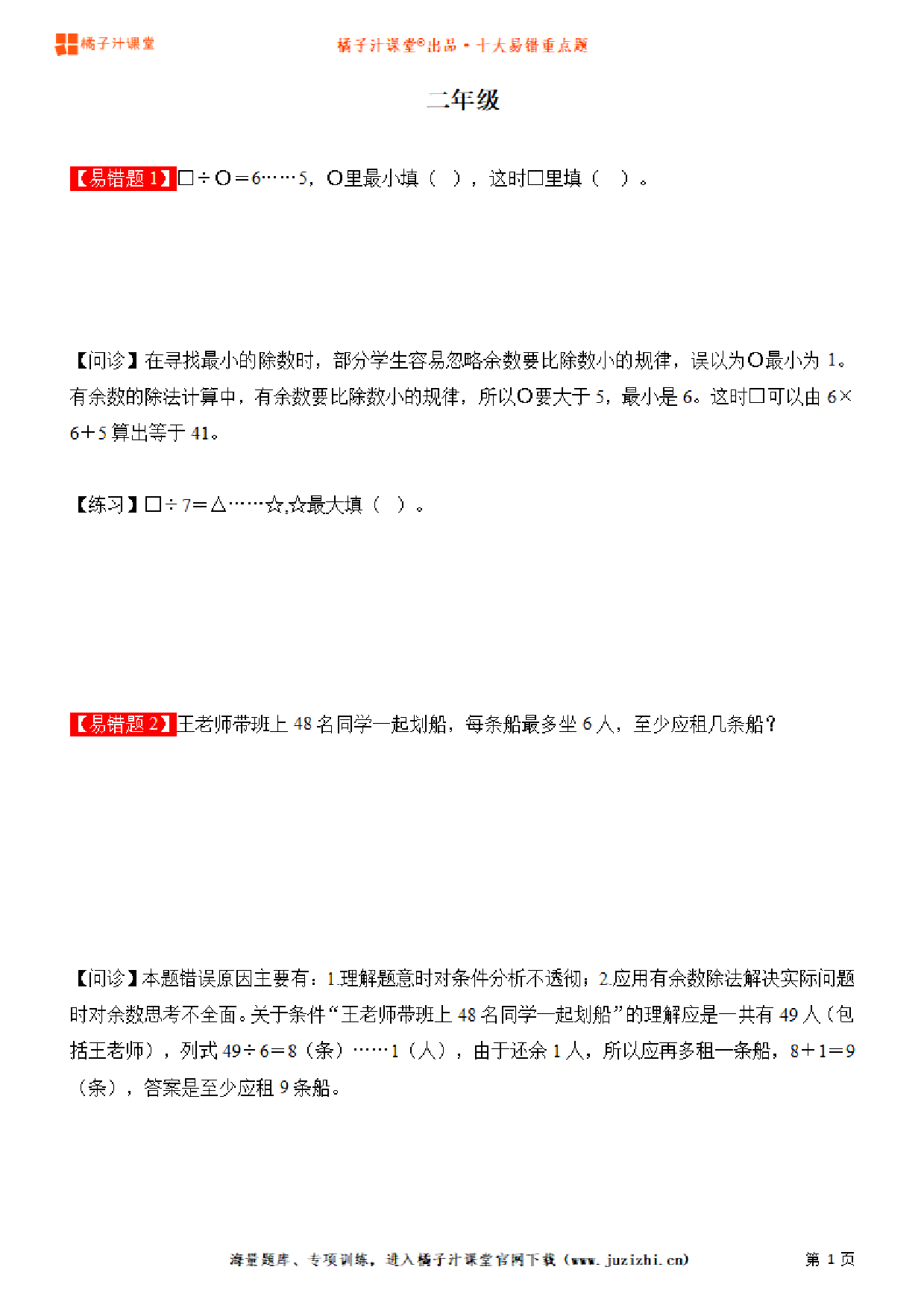 这份资料:《【人教版数学】二年级十大易错重点题》由【橘子汁课堂】整理提供,各位家长老师可直接在线下载,下载后使用打印机打印使用。也可以保存下方练习题图片打印,提供给学生可直接练习。 同时,我们也提供了手机端练习工具,可以使用手机扫描右侧卡片二维码,进入我们的题库小程序练习。