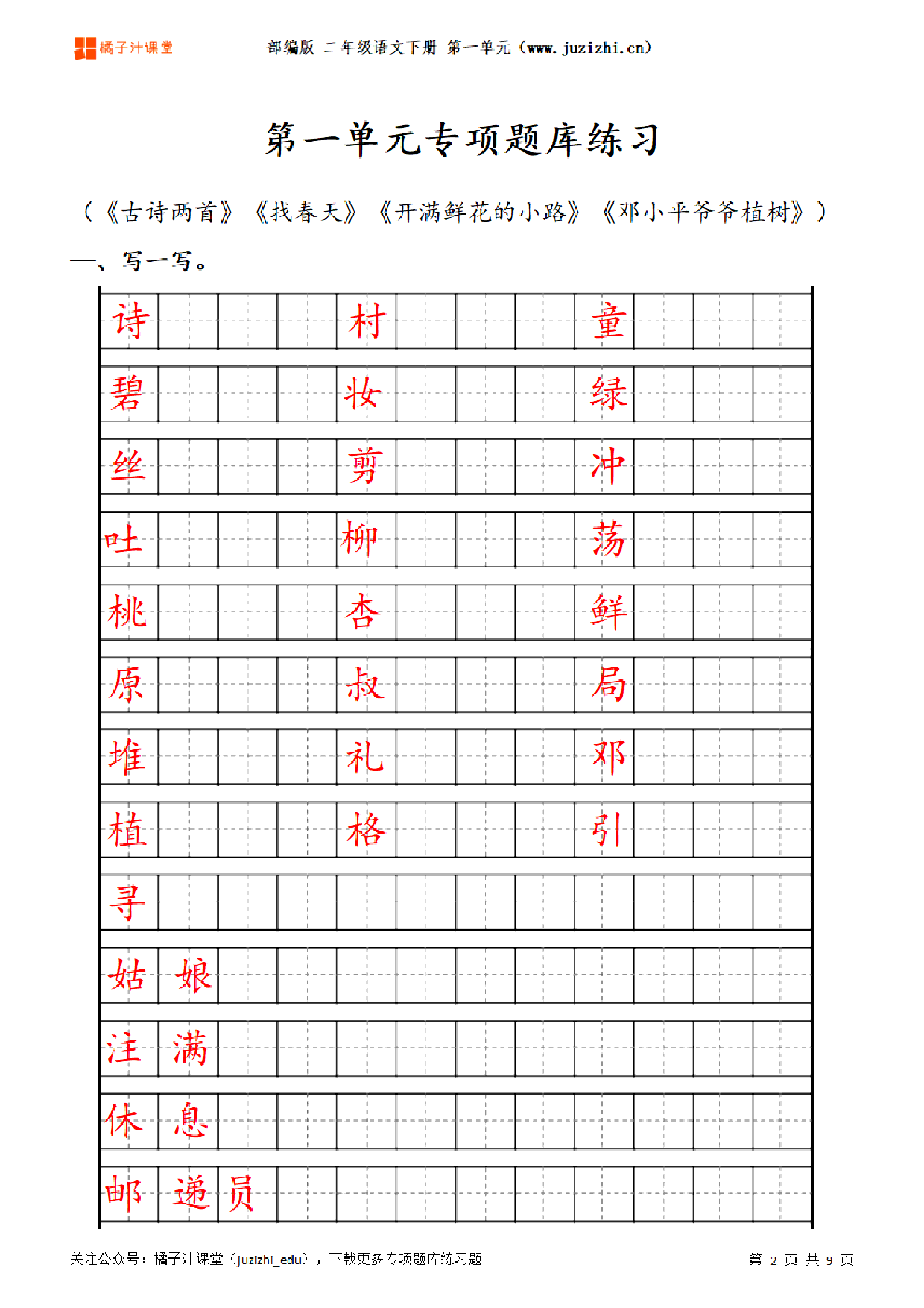 这份资料:《【部编版语文】二年级下册一单元专项题库练习题》由【橘子汁课堂】整理提供,各位家长老师可直接在线下载,下载后使用打印机打印使用。也可以保存下方练习题图片打印,提供给学生可直接练习。 同时,我们也提供了手机端练习工具,可以使用手机扫描右侧卡片二维码,进入我们的题库小程序练习。