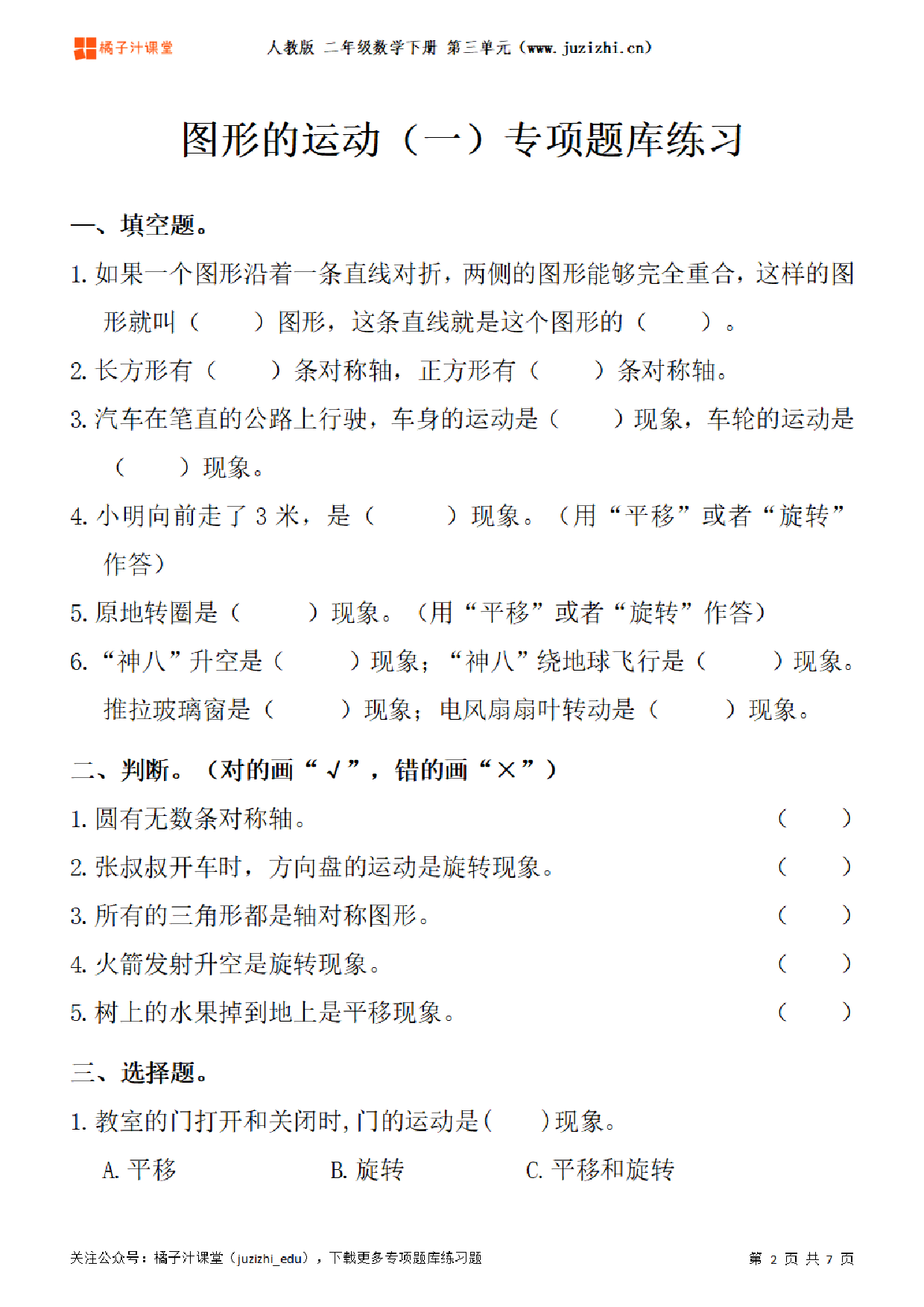 这份资料:《【人教版数学】二年级下册三单元《图形的运动(一)》专项题库练习》由【橘子汁课堂】整理提供,各位家长老师可直接在线下载,下载后使用打印机打印使用。也可以保存下方练习题图片打印,提供给学生可直接练习。 同时,我们也提供了手机端练习工具,可以使用手机扫描右侧卡片二维码,进入我们的题库小程序练习。