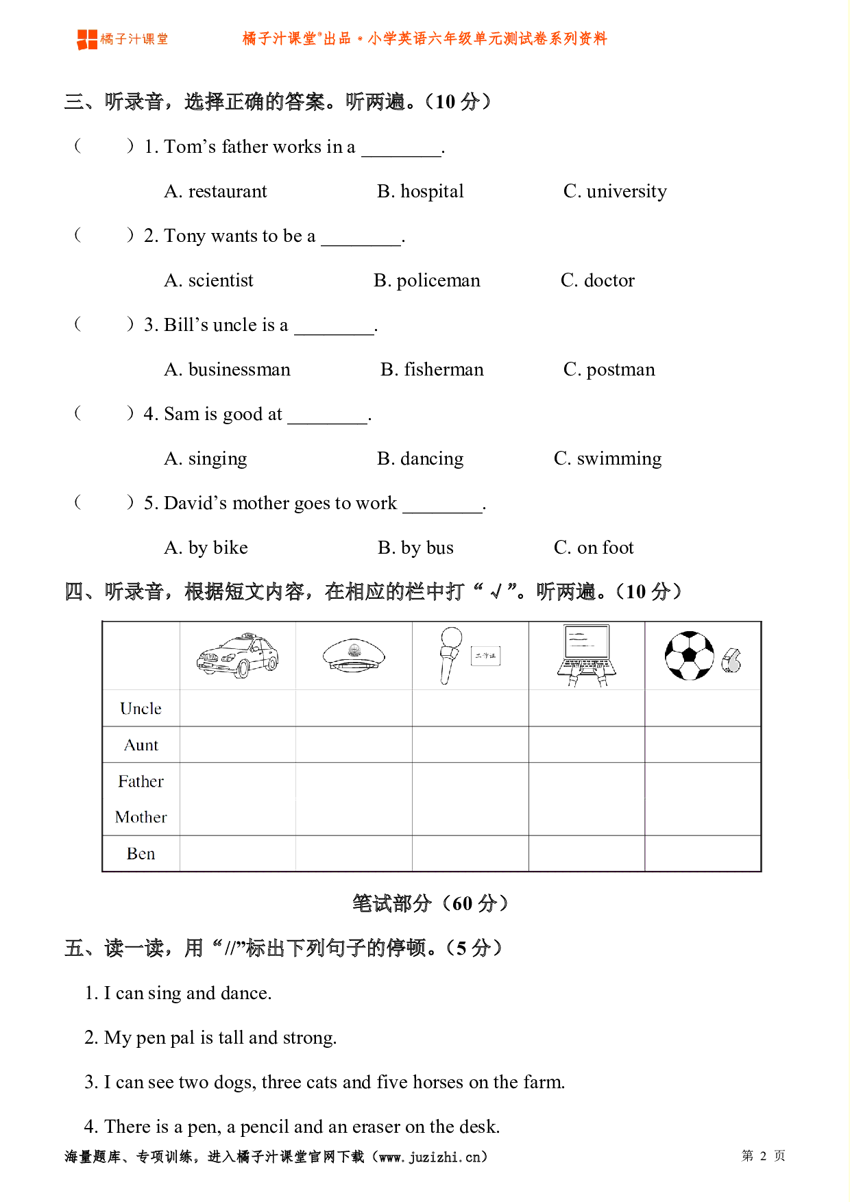 这份资料:《【人教版PEP】小学英语六年级上册Unit5 What does he do?检测卷》由【橘子汁课堂】整理提供,各位家长老师可直接在线下载,下载后使用打印机打印使用。也可以保存下方练习题图片打印,提供给学生可直接练习。 同时,我们也提供了手机端练习工具,可以使用手机扫描右侧卡片二维码,进入我们的题库小程序练习。