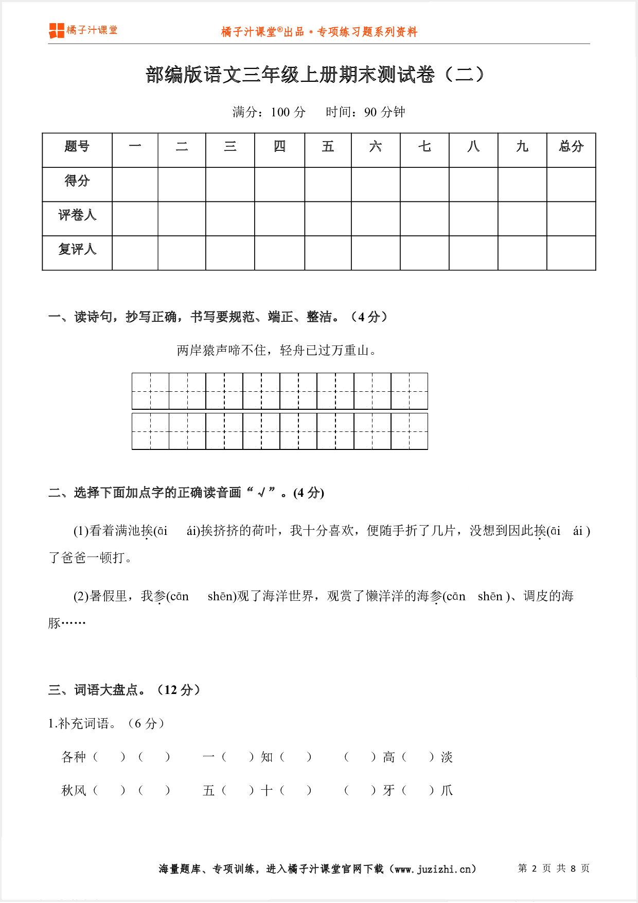 这份资料:《【部编版语文】三年级上册期末测试卷(二)》由【橘子汁课堂】整理提供,各位家长老师可直接在线下载,下载后使用打印机打印使用。也可以保存下方练习题图片打印,提供给学生可直接练习。 同时,我们也提供了手机端练习工具,可以使用手机扫描右侧卡片二维码,进入我们的题库小程序练习。