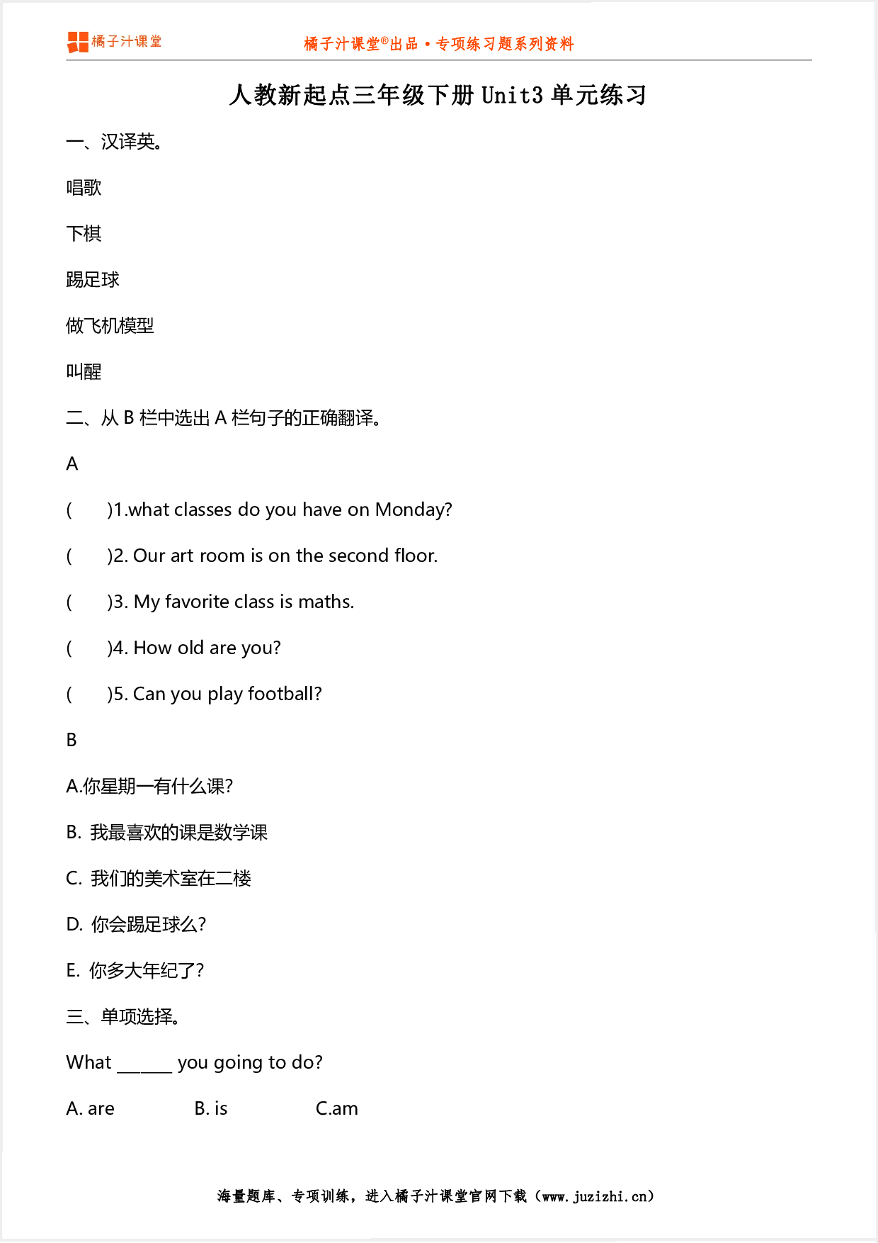 这份资料:《【人教新起点一年级起】三年级下册Unit3单元测试卷》由【橘子汁课堂】整理提供,各位家长老师可直接在线下载,下载后使用打印机打印使用。也可以保存下方练习题图片打印,提供给学生可直接练习。 同时,我们也提供了手机端练习工具,可以使用手机扫描右侧卡片二维码,进入我们的题库小程序练习。