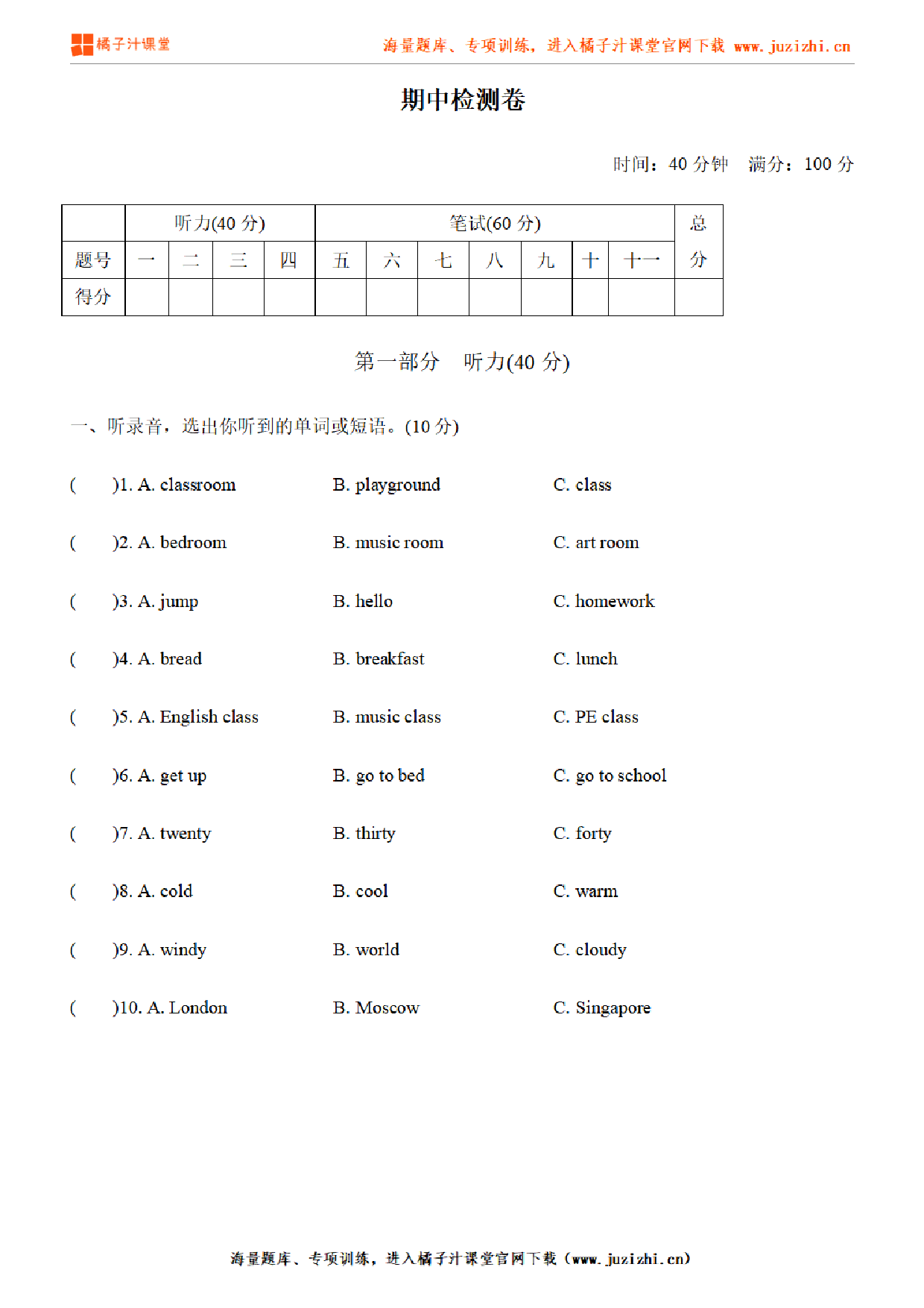 这份资料:《【PEP英语】四年级下册期中测试卷2(含听力)》由【橘子汁课堂】整理提供,各位家长老师可直接在线下载,下载后使用打印机打印使用。也可以保存下方练习题图片打印,提供给学生可直接练习。 同时,我们也提供了手机端练习工具,可以使用手机扫描右侧卡片二维码,进入我们的题库小程序练习。