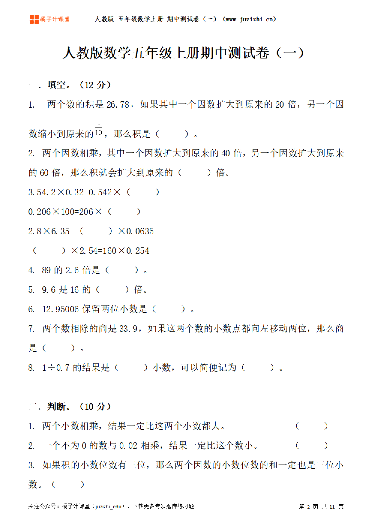 这份资料:《【人教版数学】五年级上册期中测试卷(一)》由【橘子汁课堂】整理提供,各位家长老师可直接在线下载,下载后使用打印机打印使用。也可以保存下方练习题图片打印,提供给学生可直接练习。 同时,我们也提供了手机端练习工具,可以使用手机扫描右侧卡片二维码,进入我们的题库小程序练习。