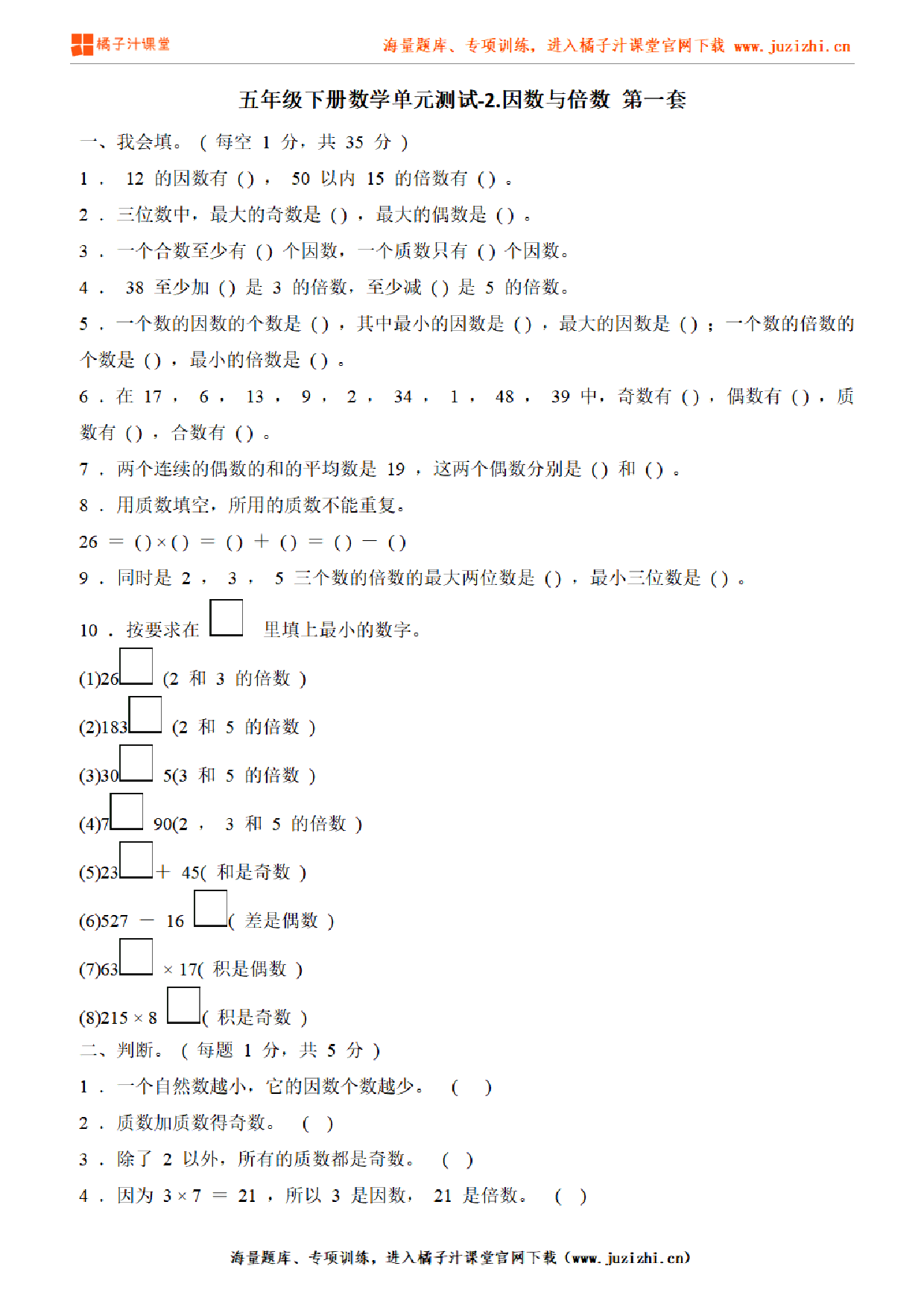 这份资料:《【人教版数学】五年级下册第二单元《因数与倍数》检测卷1(含答案)》由【橘子汁课堂】整理提供,各位家长老师可直接在线下载,下载后使用打印机打印使用。也可以保存下方练习题图片打印,提供给学生可直接练习。 同时,我们也提供了手机端练习工具,可以使用手机扫描右侧卡片二维码,进入我们的题库小程序练习。