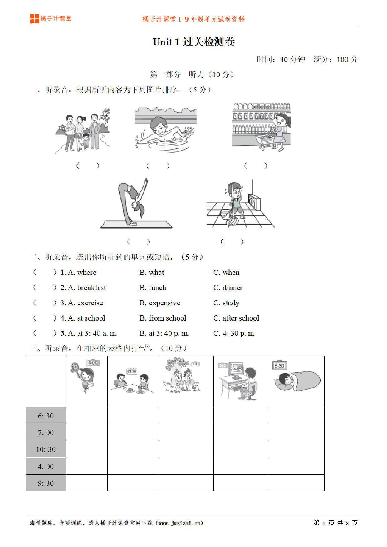 这份资料:《【人教版英语】五年级下册unit1单元测试卷(含听力)》由【橘子汁课堂】整理提供,各位家长老师可直接在线下载,下载后使用打印机打印使用。也可以保存下方练习题图片打印,提供给学生可直接练习。 同时,我们也提供了手机端练习工具,可以使用手机扫描右侧卡片二维码,进入我们的题库小程序练习。