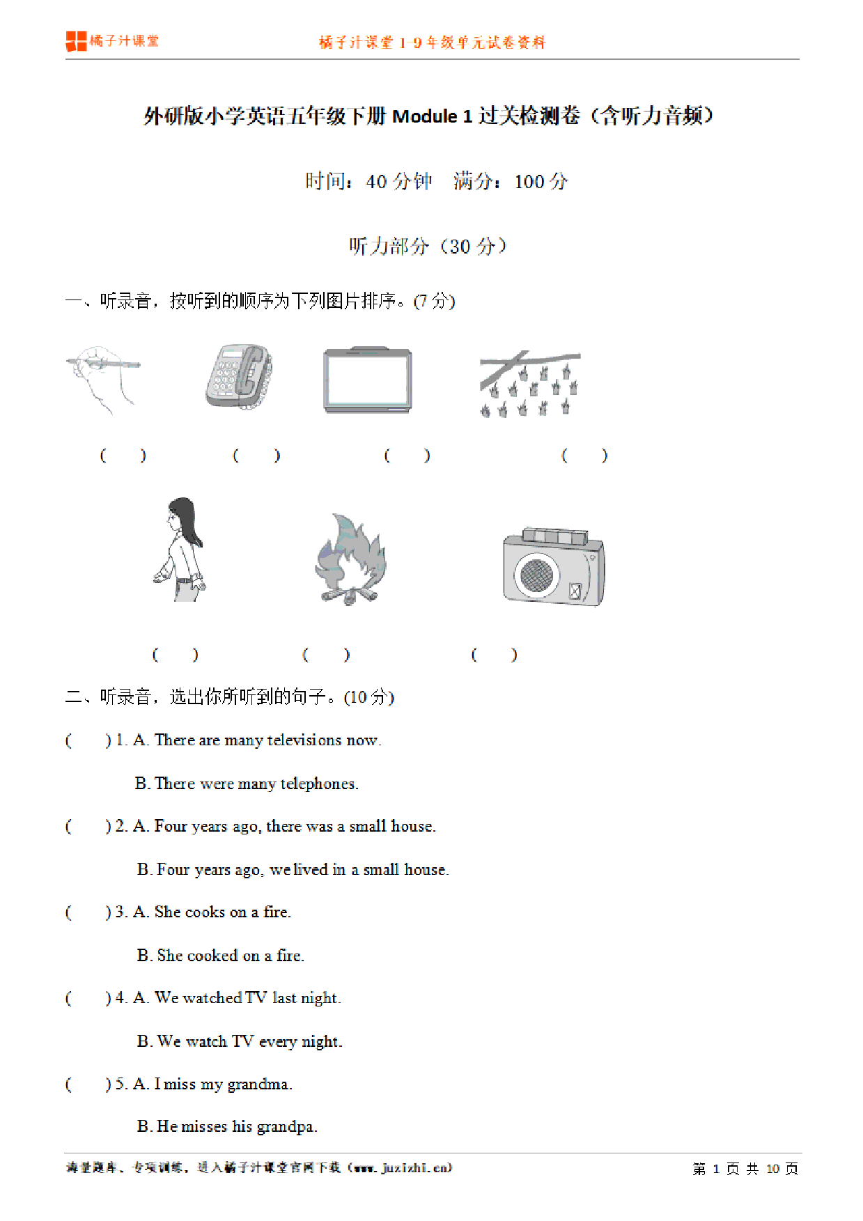 这份资料:《【外研版英语】五年级下册unit9单元测试卷(含听力)》由【橘子汁课堂】整理提供,各位家长老师可直接在线下载,下载后使用打印机打印使用。也可以保存下方练习题图片打印,提供给学生可直接练习。 同时,我们也提供了手机端练习工具,可以使用手机扫描右侧卡片二维码,进入我们的题库小程序练习。