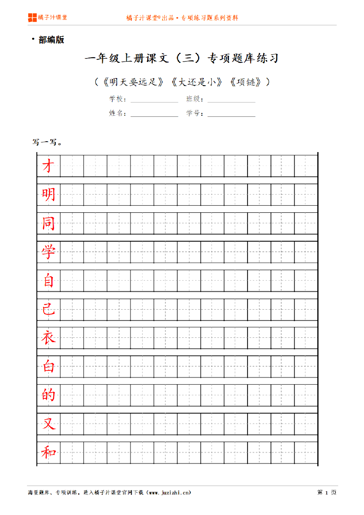 这份资料:《【部编版语文】一年级上册第七单元专项练习题》由【橘子汁课堂】整理提供,各位家长老师可直接在线下载,下载后使用打印机打印使用。也可以保存下方练习题图片打印,提供给学生可直接练习。 同时,我们也提供了手机端练习工具,可以使用手机扫描右侧卡片二维码,进入我们的题库小程序练习。