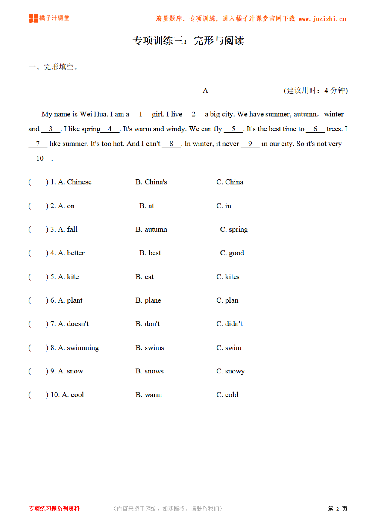这份资料:【PEP英语】五年级下册专项练习《完形与阅读》测试卷由【橘子汁课堂】整理提供,各位家长老师可直接在线下载,下载后使用打印机打印使用。也可以保存下方练习题图片打印,提供给学生可直接练习。 同时,我们也提供了手机端练习工具,可以使用手机扫描右侧卡片二维码,进入我们的题库小程序练习。