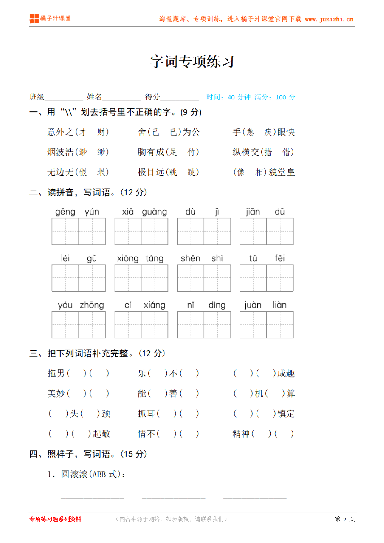 这份资料:【部编版语文】五年级下册专项练习册《字词》测试卷由【橘子汁课堂】整理提供,各位家长老师可直接在线下载,下载后使用打印机打印使用。也可以保存下方练习题图片打印,提供给学生可直接练习。 同时,我们也提供了手机端练习工具,可以使用手机扫描右侧卡片二维码,进入我们的题库小程序练习。
