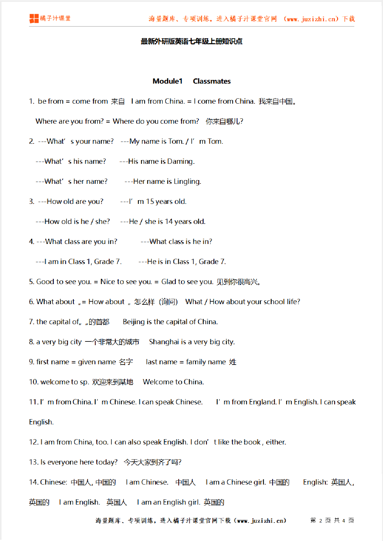 这份资料:《外研版初中英语七年级上册 Module 1 知识点》由【橘子汁课堂】整理提供,各位家长老师可直接在线下载,下载后使用打印机打印使用。也可以保存下方练习题图片打印,提供给学生可直接练习。 同时,我们也提供了手机端练习工具,可以使用手机扫描右侧卡片二维码,进入我们的题库小程序练习。