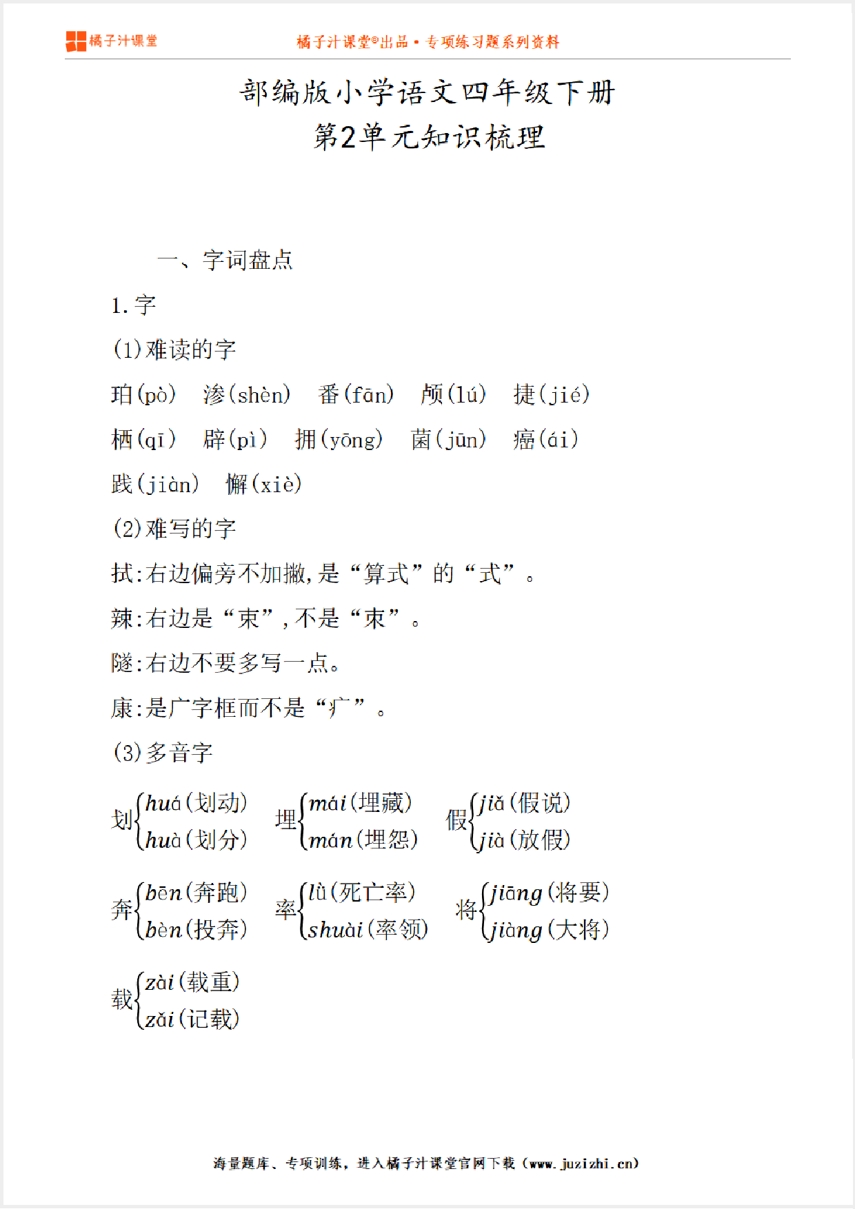 这份资料:《【部编版】小学语文4年级下册第2单元知识点》由【橘子汁课堂】整理提供,各位家长老师可直接在线下载,下载后使用打印机打印使用。也可以保存下方练习题图片打印,提供给学生可直接练习。 同时,我们也提供了手机端练习工具,可以使用手机扫描右侧卡片二维码,进入我们的题库小程序练习。