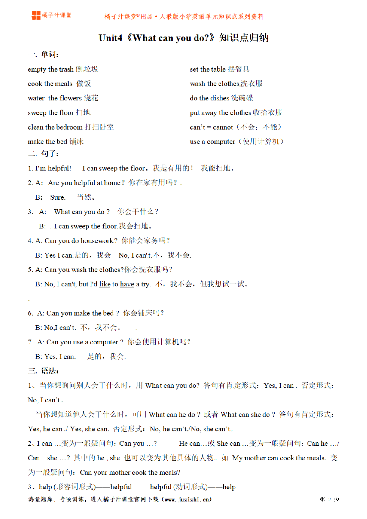 这份资料:《【人教PEP】5年级英语上册unit4知识点梳理》由【橘子汁课堂】整理提供,各位家长老师可直接在线下载,下载后使用打印机打印使用。也可以保存下方练习题图片打印,提供给学生可直接练习。 同时,我们也提供了手机端练习工具,可以使用手机扫描右侧卡片二维码,进入我们的题库小程序练习。
